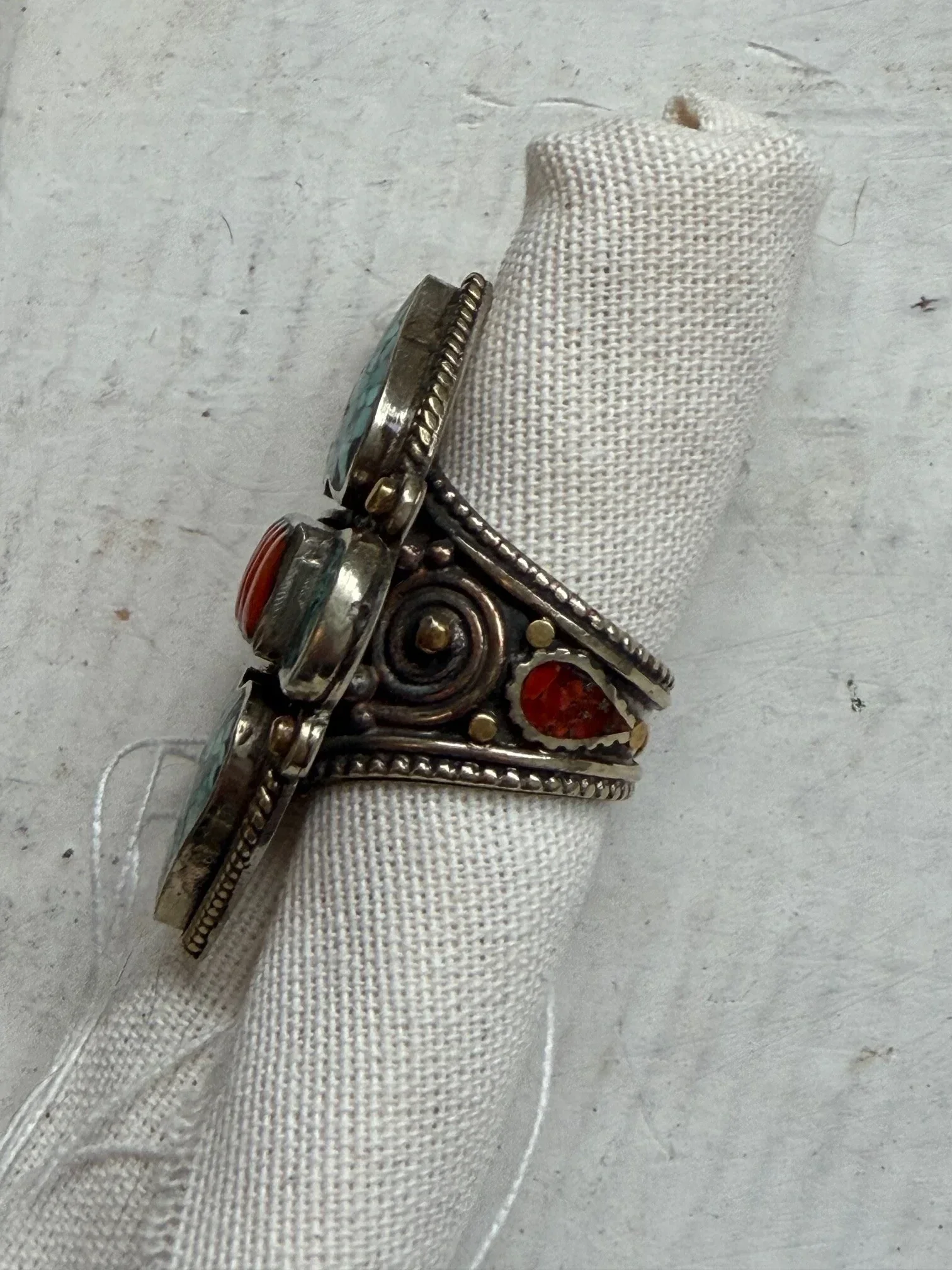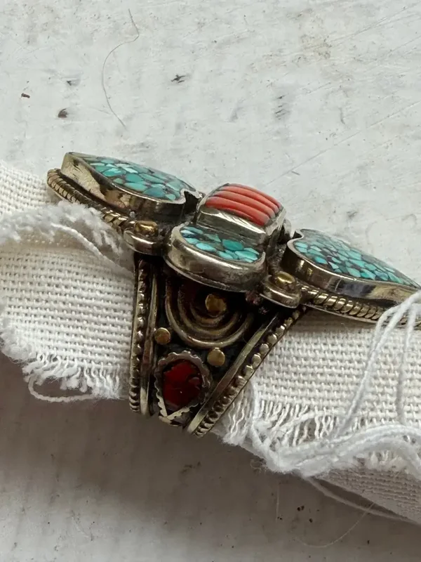 Deze grote ring heeft een uitgesproken etnische uitstraling en is een echte eyecatcher. De combinatie van turquoise mozaïek en warm koraal geeft het sieraad een krachtig, bijna tribal karakter.